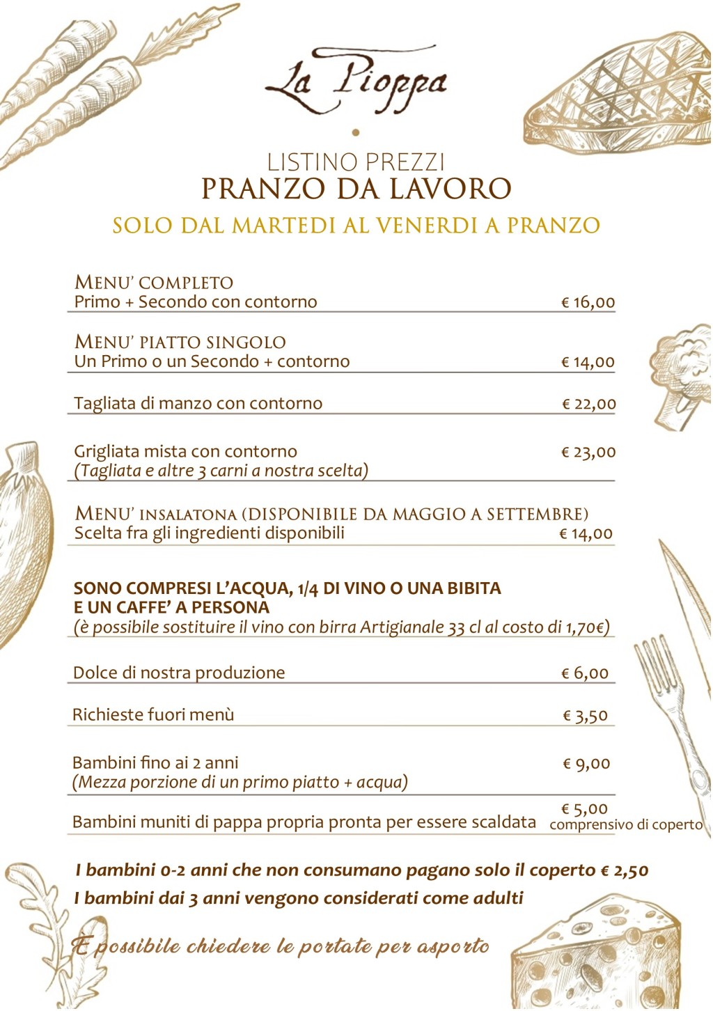 Al momento della prenotazione andrà comunicato il numero massimo di partecipanti. Entro 48 ore prima dell’evento andrà invece comunicato il numero esatto tramite mail a info@agriturismolapioppa.it Successivamente le assenze rispetto al numero ultimo comunicato verranno addebitate al 50% del prezzo del menù.