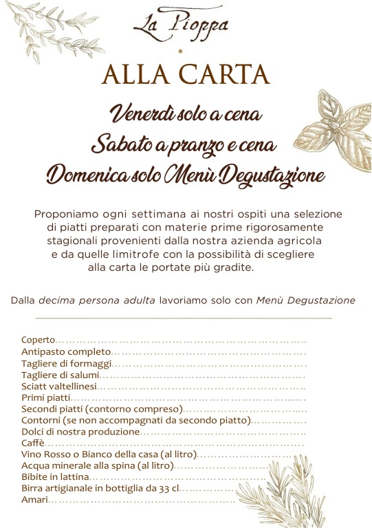 Al momento della prenotazione andrà comunicato il numero massimo di partecipanti. Entro 48 ore prima dell’evento andrà invece comunicato il numero esatto tramite mail a info@agriturismolapioppa.it Successivamente le assenze rispetto al numero ultimo comunicato verranno addebitate al 50% del prezzo del menù.
